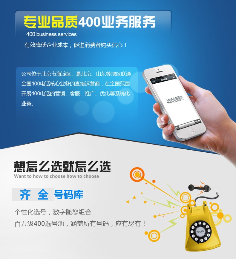 現(xiàn)在企業(yè)網(wǎng)站上面的聯(lián)系方式實在讓用戶很糾結(jié),掛一個手機,給人感覺是個體戶。掛一個固話又沒有人接聽,每個月都純粹交月租。建議有條件的選擇400電話,自從2016年整改實名制以來,現(xiàn)在的400電話都非常真實可靠,反而提高了公司的誠信度。我們書北信息是一級的400電話代理商,期待與您合作。